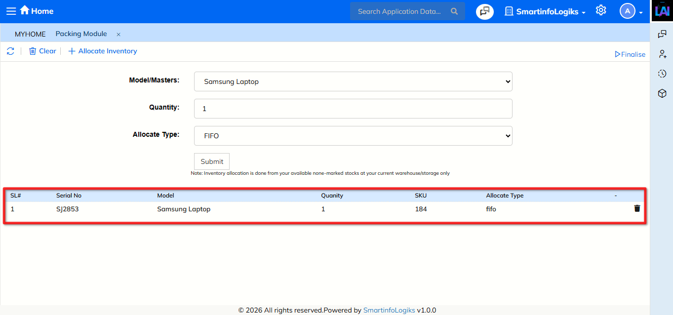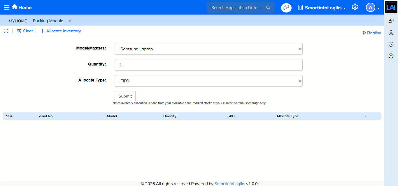 Click Submit to allocate inventory based on the selected model, quantity, and allocation type.