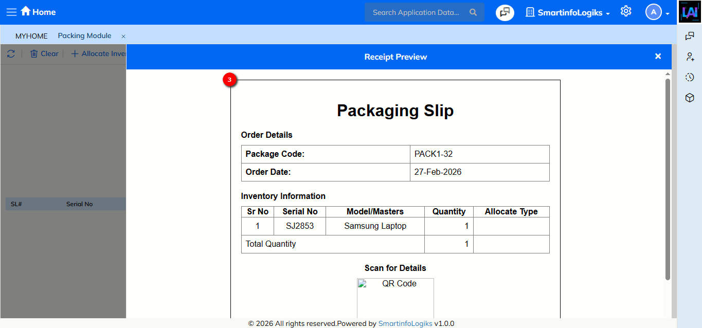 The Packaging Module is used to allocate inventory for packaging based on selected product models/masters and allocation rules (such as FIFO). It ensures that only available, non-marked stock from the current warehouse or storage location is used.