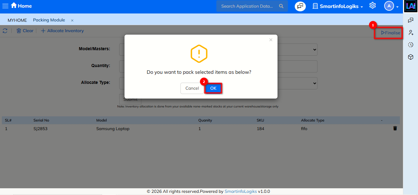 Click Finalise to complete the packaging process and generate a packaging slip.
